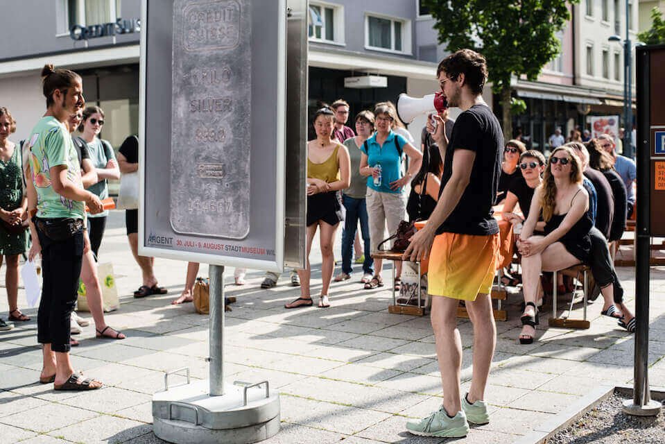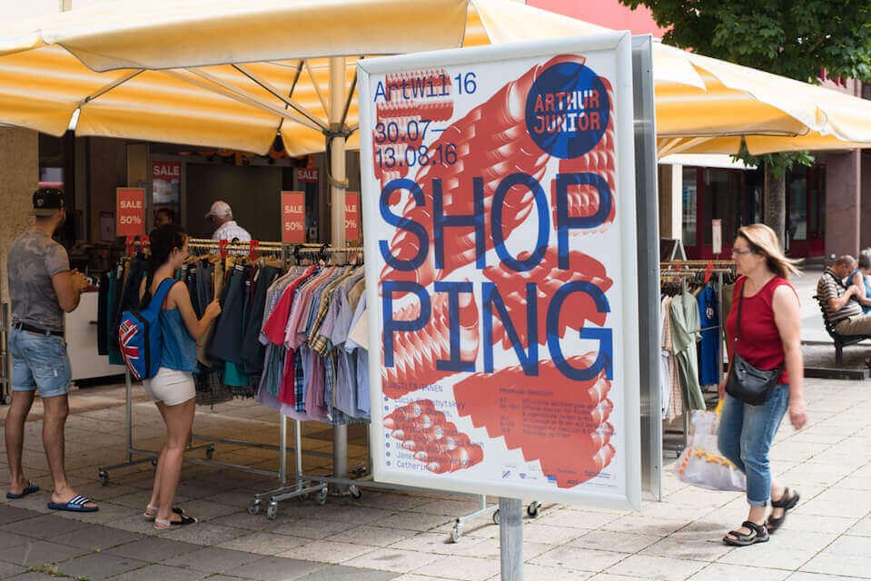 Catherine Xu, Samuel Koch, Nina Emge, Lucie Biloshytskyy, James Stephen Wright, Domingo Chaves, Edmée Laurin, Fridolin Schoch and Martina Mächler received six orange envelopes on 9 July 2016. Six thousand Swiss francs in thousand notes - the most valuable banknote in the world. The artists had the task of spending all the money on Obere Bahnhofstrasse, the shopping street of Wil. The works that were presented to the public from July 30th to August 13th, 2016 and were created from the purchased goods. Shopping dealt with a theme that has always moved society and the art world. We want it, we love it and we do it. From young to old. Whether conscious, ecological or wasteful. We shop, we choose and shopping should be fun, or not?! That's why the cross-media art project treated consumption as a act of life and asked questions. Questions about the commodity art, artistic work and investment in general. The artistic processes were documented and part of the exhibition, which was initiated by Arthur Junior and the City of Wil in collaboration with the graphic design studio Badesaison.